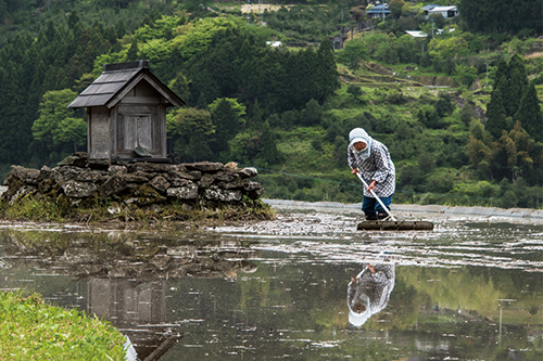 田均しの風景です。お米は日本の食文化の中心であり、先祖代々、受け継がれている水田は全国各地で見ることができます。自然とともに生きる、日本人の原風景と言える営みを見つめたことが素晴らしいです。