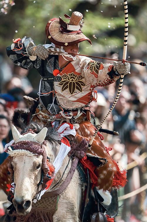 疾走する白馬の上で鏑矢を射る瞬間を写真に収めています。カメラの方へ向かってくる動きでもしっかりピントを合わせ、フレーミングに隙がありません。桜花が舞い散る姿も写り、麗しさを感じた一枚です。